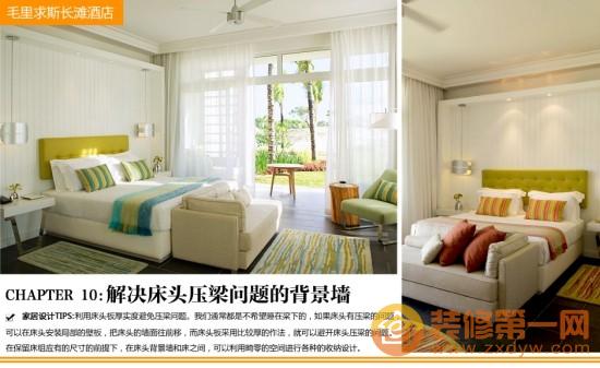 商业空间分析:客房设计的主要颜色是水蓝,黄绿和珊瑚色。床头背景墙采用了简洁线条的纹理木材,尽管这里的床头背景墙并不是因为压梁问题而设计的,但这款设计确定能够很好地应用到解决床头压梁的问题上。中性珊瑚色调,天然石材,木材原料让背景墙和整体卧室形成自然密切的联系,使整个卧室环境温暖而平静。